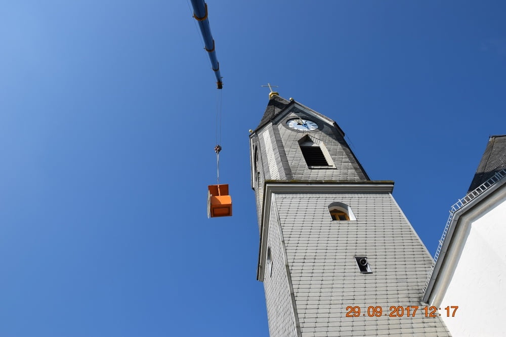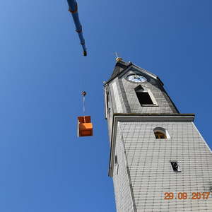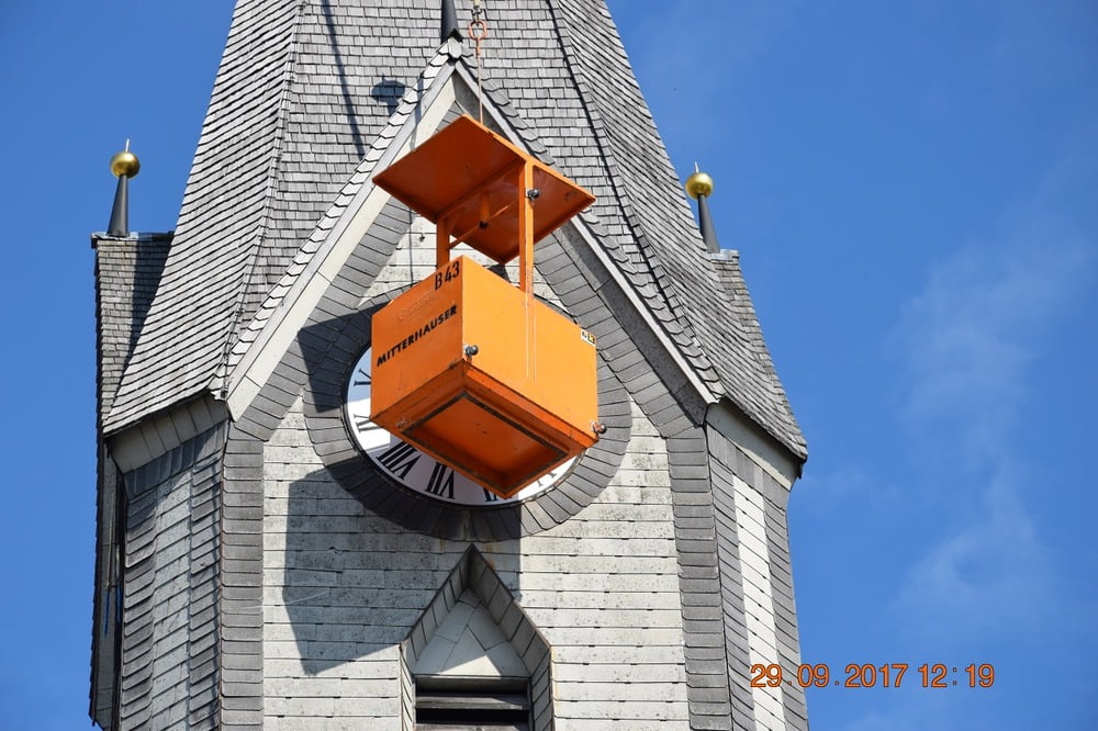 Am Freitag, den 29. September wurde das südseitige Ziffernblatt der Kirchturmuhr wieder befestigt.