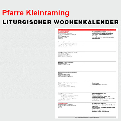 Kalender mit den Terminen und den Kontaktpersonen der Pfarrgemeinde von Kleinraming für das Jahr 2025.