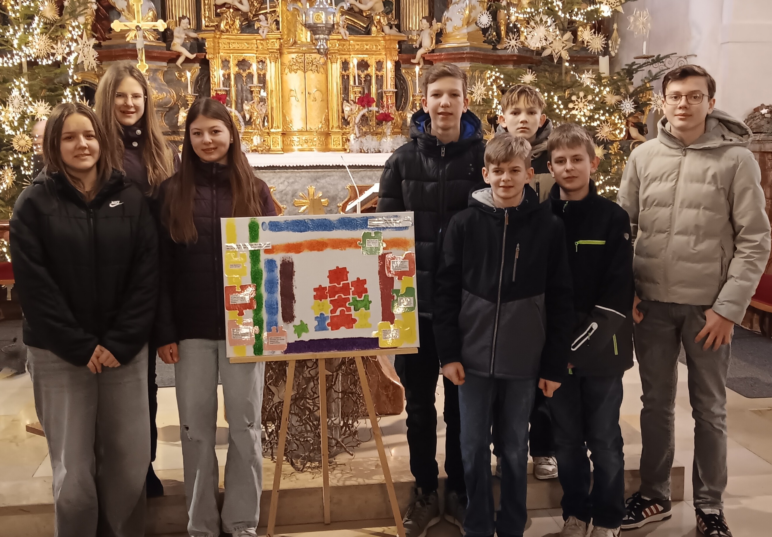 Am 26. Jänner gestalteten die drei Firmkandidatinnen und fünf Firmkandidaten des heurigen Jahres den Gottesdienst und wählten das Thema „Jeder ist wichtig – jeder gehört dazu“. Zur Vorbereitung der Messe trafen sie sich eine Woche vorher und beschäftigten sich in Gruppen- und Einzelarbeiten intensiv mit dem 12. Kapitel des 1. Korintherbriefes. Daraus entstanden die Texte für den Bußakt sowie ein Bild, das einerseits die für sie wichtigen Grundaussagen aus dem Bibeltext enthält und andererseits ihre Gedanken, wie sie sich mit ihren Fähigkeiten aktiv in die Pfarrgemeinschaft einbringen wollen. Im Rahmen der Messe stellten sie ihre Ergebnisse kurz vor.