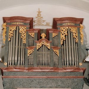 Die Orgel wurde 1841 fertiggestellt und später öfter restauriert, zuletzt 2013. An der Brüstung der Orgelempore finden sich Darstellungen der 12 Apostel und ein Gemälde von der Krönung Mariens im Himmel.
