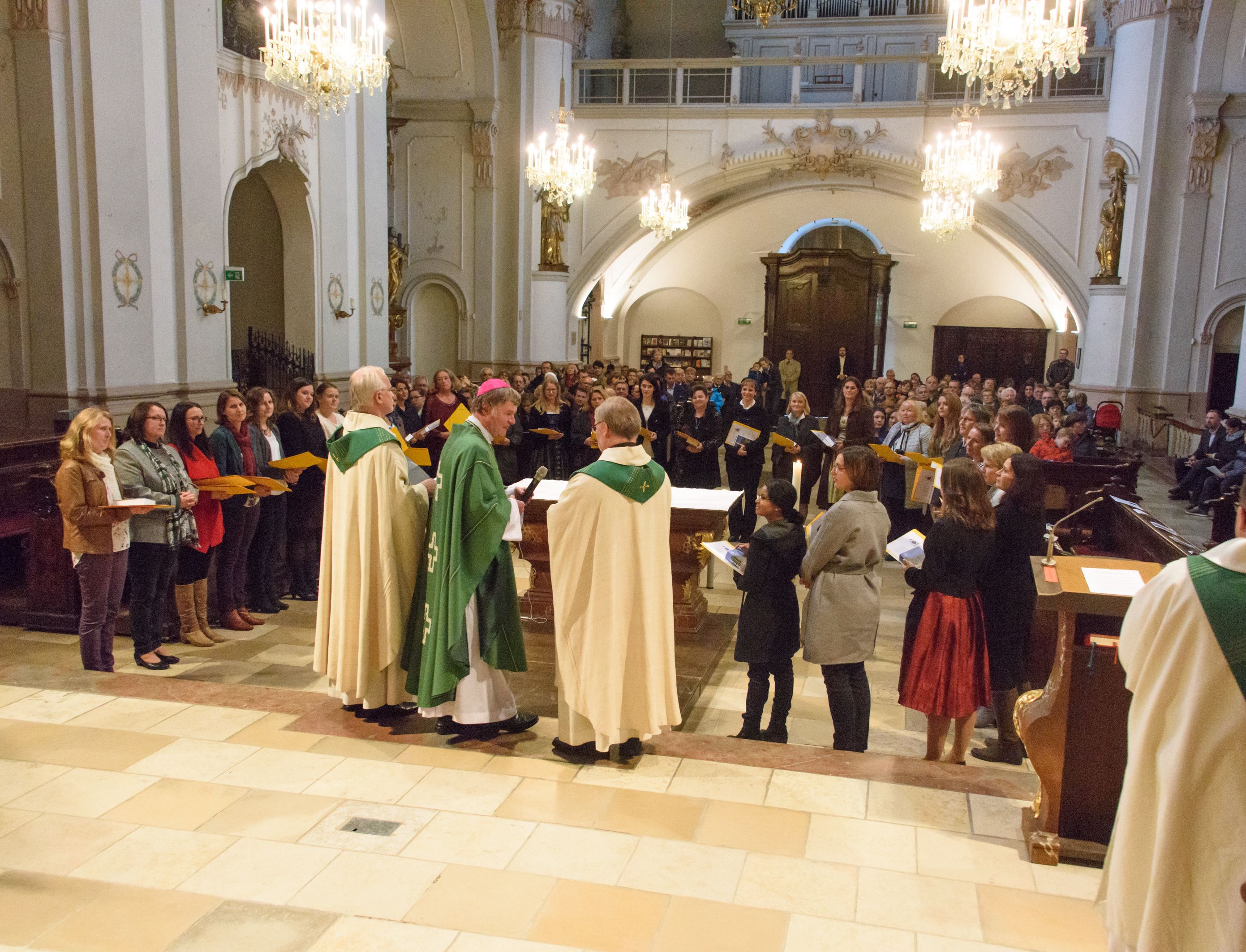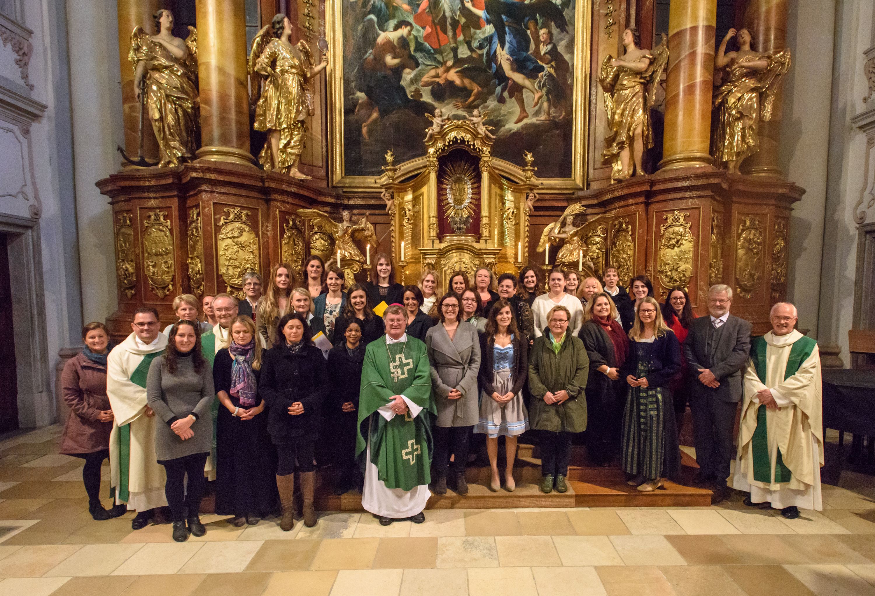 Foto 2: Sendungsfeier der Religionslehrerinnen in der Linzer Ursulinenkirche. Die Gesendeten haben sich um den Altar versammelt.